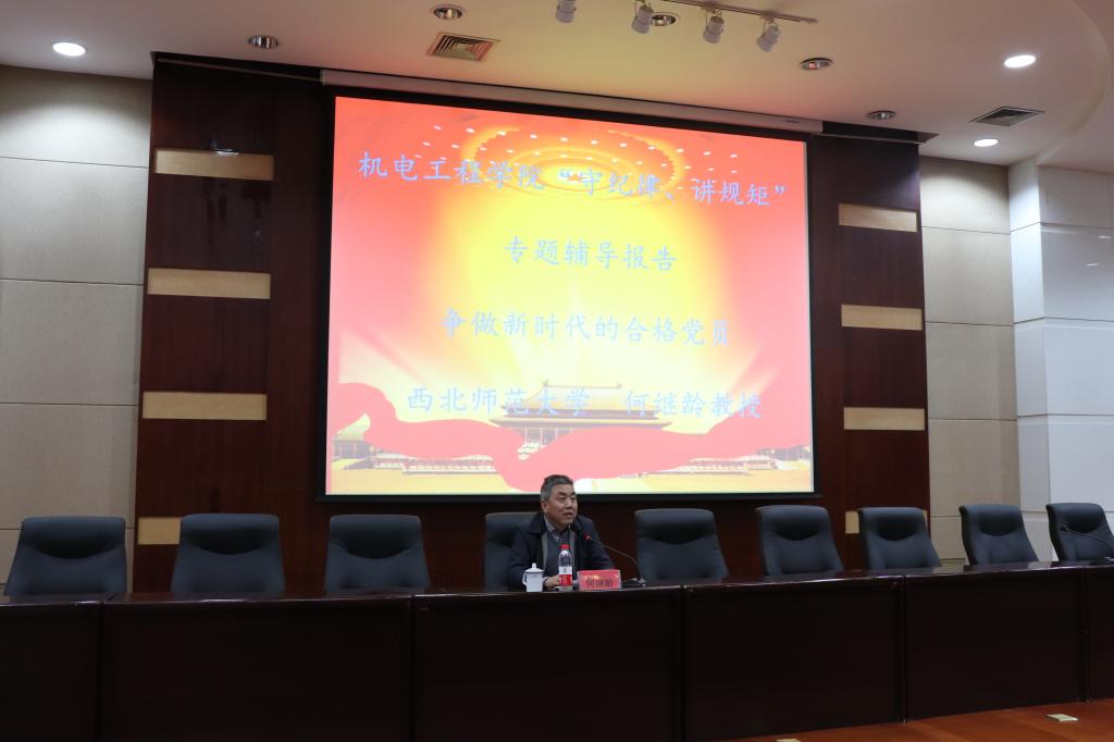 11月1日下午,机电工程学院在教育科技中心三楼大报告厅举行了“争做新时代合格党员”及“守纪律、讲规矩”两场师生党员报告会。甘肃省委理论宣讲团成员、甘肃省委讲师团成员、全国优秀教师、西北师范大学何继龄教授作了题为“争做新时代合格党员”的报告会。全院89名教工党员和210名研究生党员聆听了报告会。