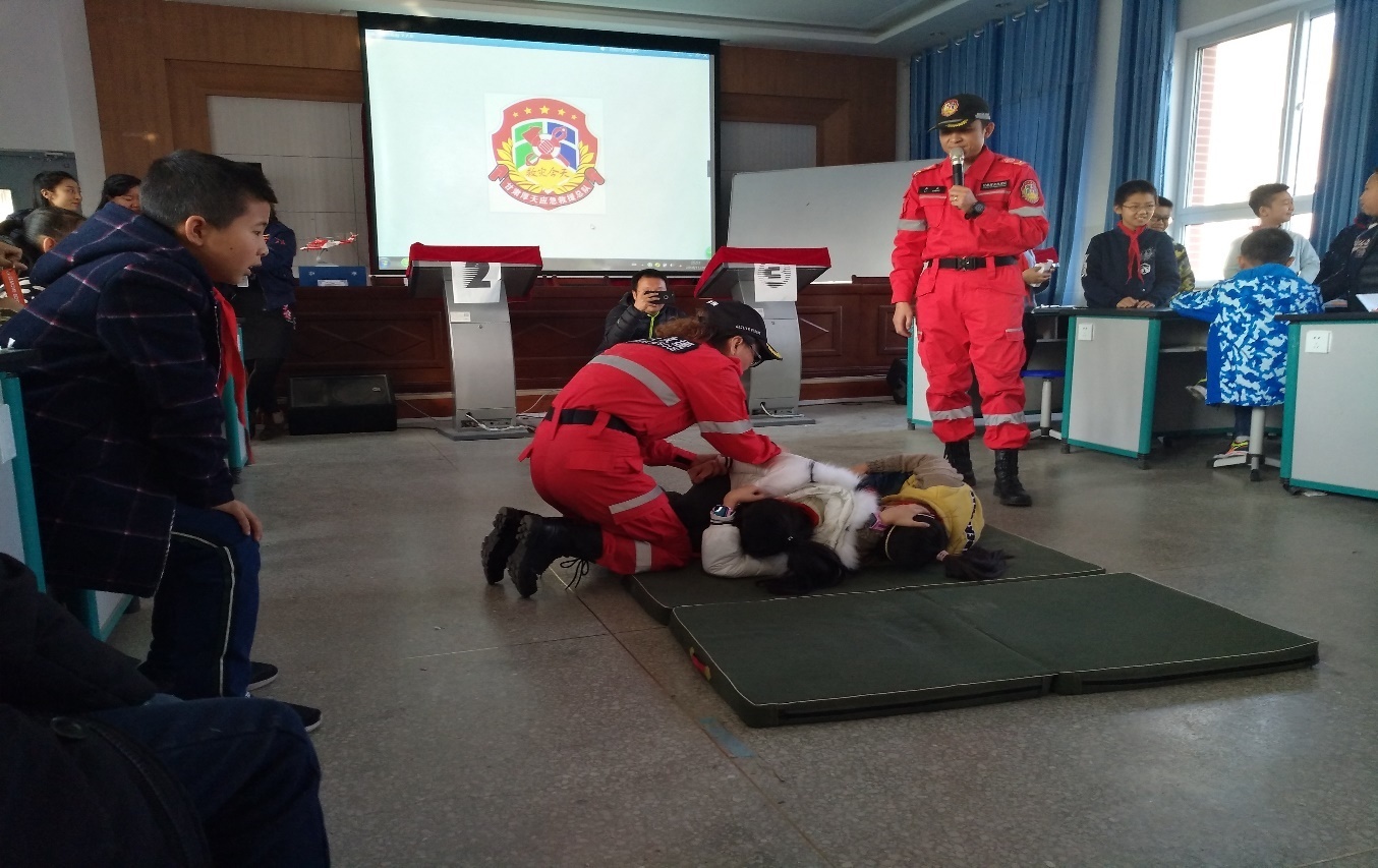 甘肃厚天救援中心的工作人员为附小师生现场进行了逃生演练和防踩踏演练。并反复示范,教会在场的同学在遇到火灾、地震、交通事故等突发状况下迅速从座位上起立,快速有序地奔向走廊,弯腰、猫步,用毛巾、手帕捂住口鼻,有序撤离。在场部分同学在工作人员的指导下进行了逃生、疏散练习。活动最后,工作人员进行了遭遇踩踏时自救技能的讲解和示范,教会在场同学正卧和侧卧两种姿势进行遇险自救,保护自己,将意外伤害降到最低。