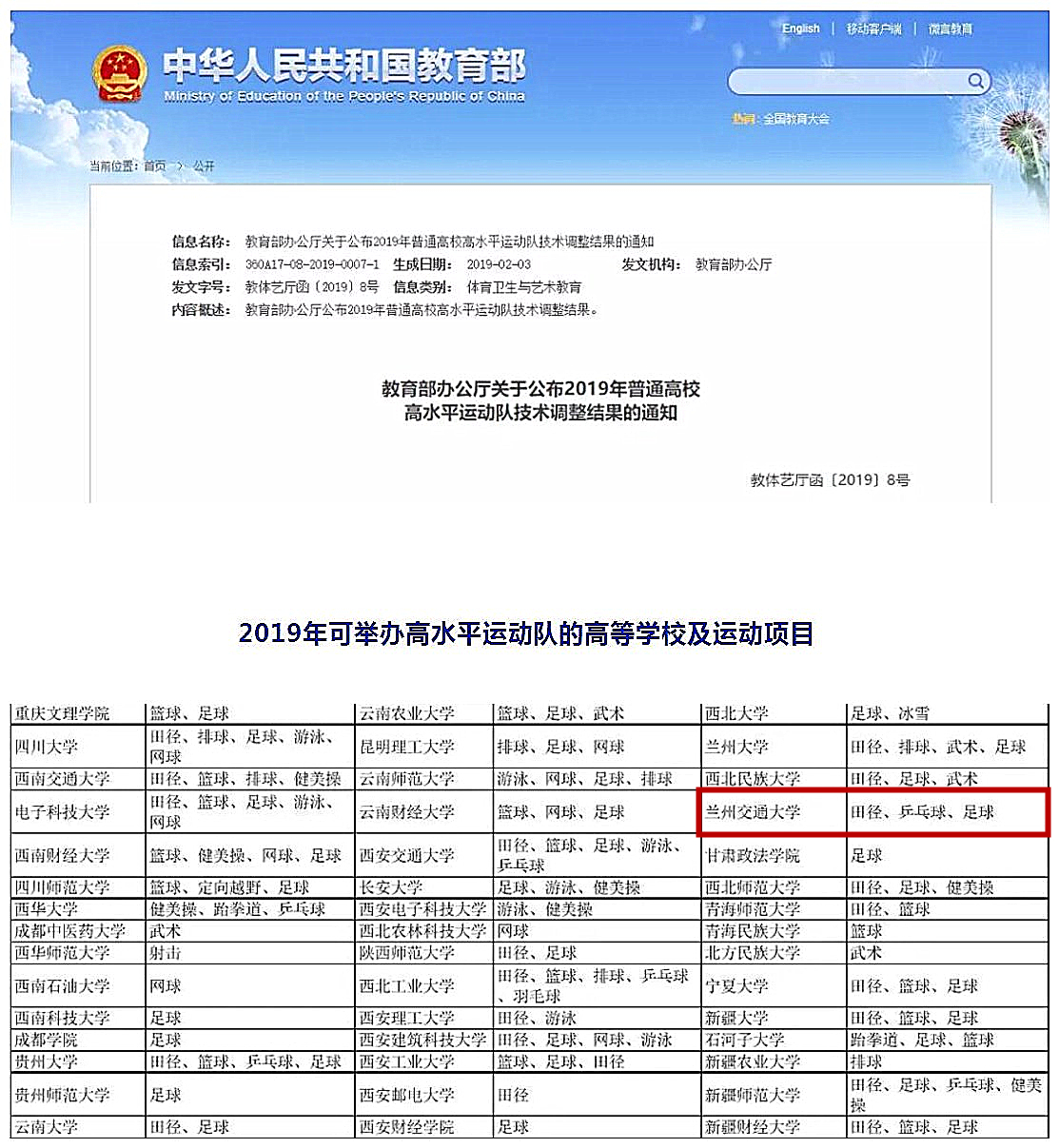 2月3日,教育部公布了2019年全国普通高校高水平运动队招生技术调整结果,我校新获批足球项目高水平运动员招生资格。至此,在原有田径和乒乓球两个项目的基础上,我校高水平运动员招生资格专业项目达到3个。