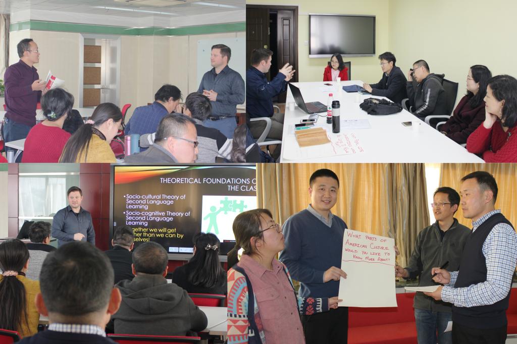 培训采用小班授课方式,3-18周开课,每周2课时课堂讲授,2课时自由交流,由美籍教师Christopher William Wood执教。Christopher毕业于美国知名大学,拥有跨文化和第二语言教学双硕士学位,具有丰富的跨文化交际和教学经验。开课前一周外教与参训教师一对一进行交流,了解每位教师英语听说能力及学习需求,根据参训教师的英语听说水平划分了基础班和提高班,并针对每个班级定制了对应的教学内容和教学方法。