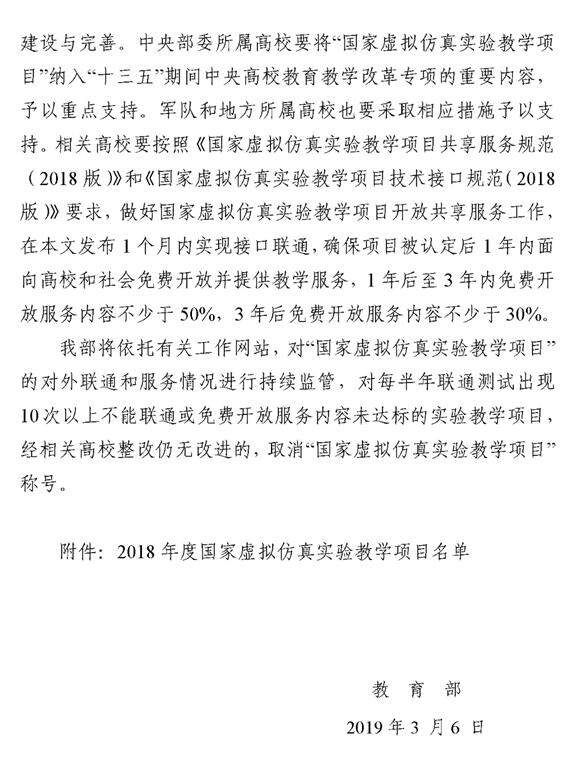 我校将严格按照《国家虚拟仿真实验教学项目共享服务规范(2018 版)》和《国家虚拟仿真实验教学项目技术接口规范(2018版)》要求,做好国家虚拟仿真实验教学项目的持续建设和开放共享服务工作。2019年,我校将继续推动虚拟仿真实验教学项目建设,积极培育申报省级、国家级虚拟仿真实验教学项目,提高实验教学质量和水平,促进优质教育资源应用与共享。