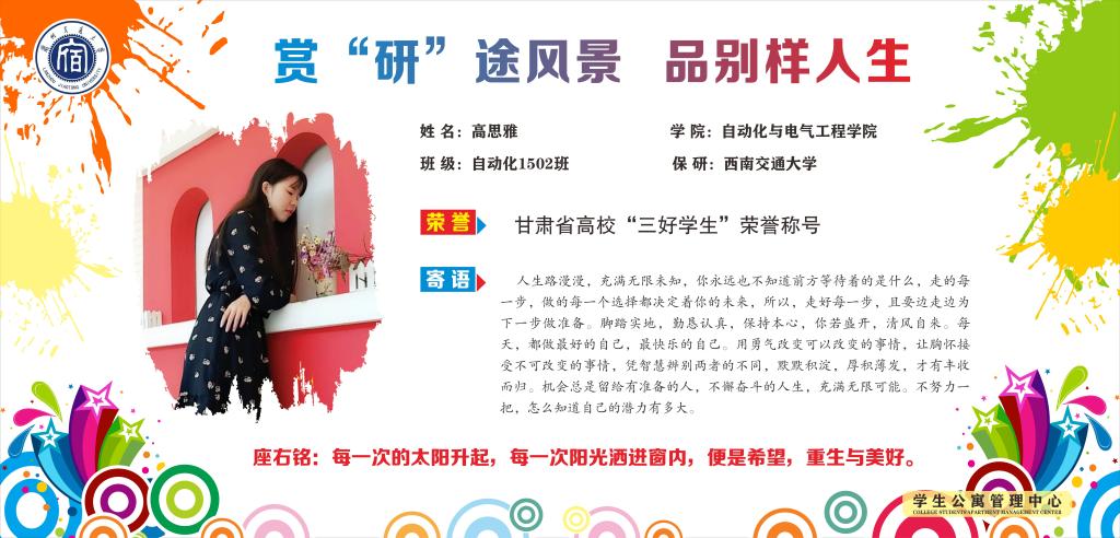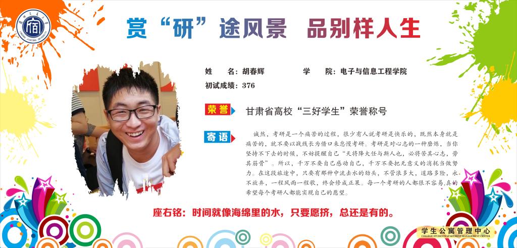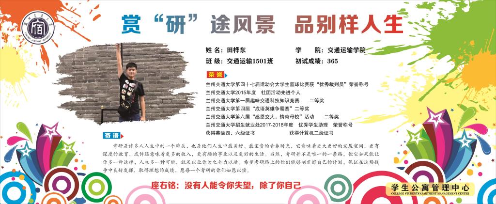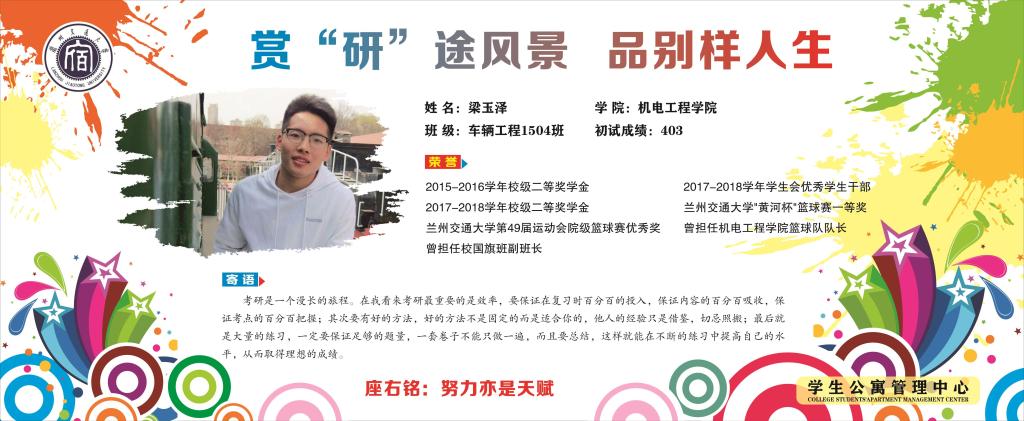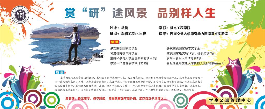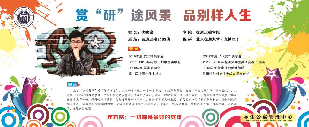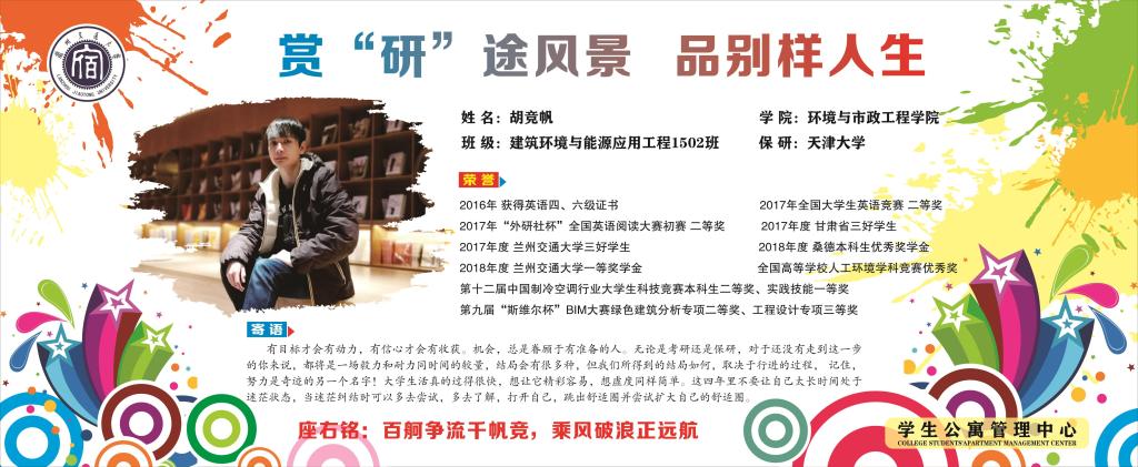 活动汇集了2018-2019年度四十多位保研及考研成绩优异的学生,他们来自全校各个学院,畅谈考研心得,传授备考方法,寄语学弟学妹。本次活动是对全校优秀学生青春风采的一次集中展示,是先进校园文化进公寓的典型示范,旨在传承和弘扬兰州交通大学“尚德励志、博学笃行”的校训,充分发挥优秀学生的榜样示范作用。此次展览活动充分利用宿舍阵地,传播校园先进文化的同时,推动我校“平安公寓、数字公寓、生态公寓、文明公寓”的建设。