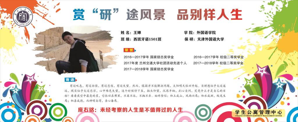 近期,为坚持把立德树人作为高等教育事业发展的中心环节,加快学生公寓全方位育人平台建设,把思想政治工作贯穿学生学习和生活的全过程,把学生宿舍开辟为全过程育人的新阵地,学生公寓管理中心精心打造了“赏研途风景,品别味人生”主题展览活动,在全校所有公寓区集中展出了今年我校优秀学子的考研成果。