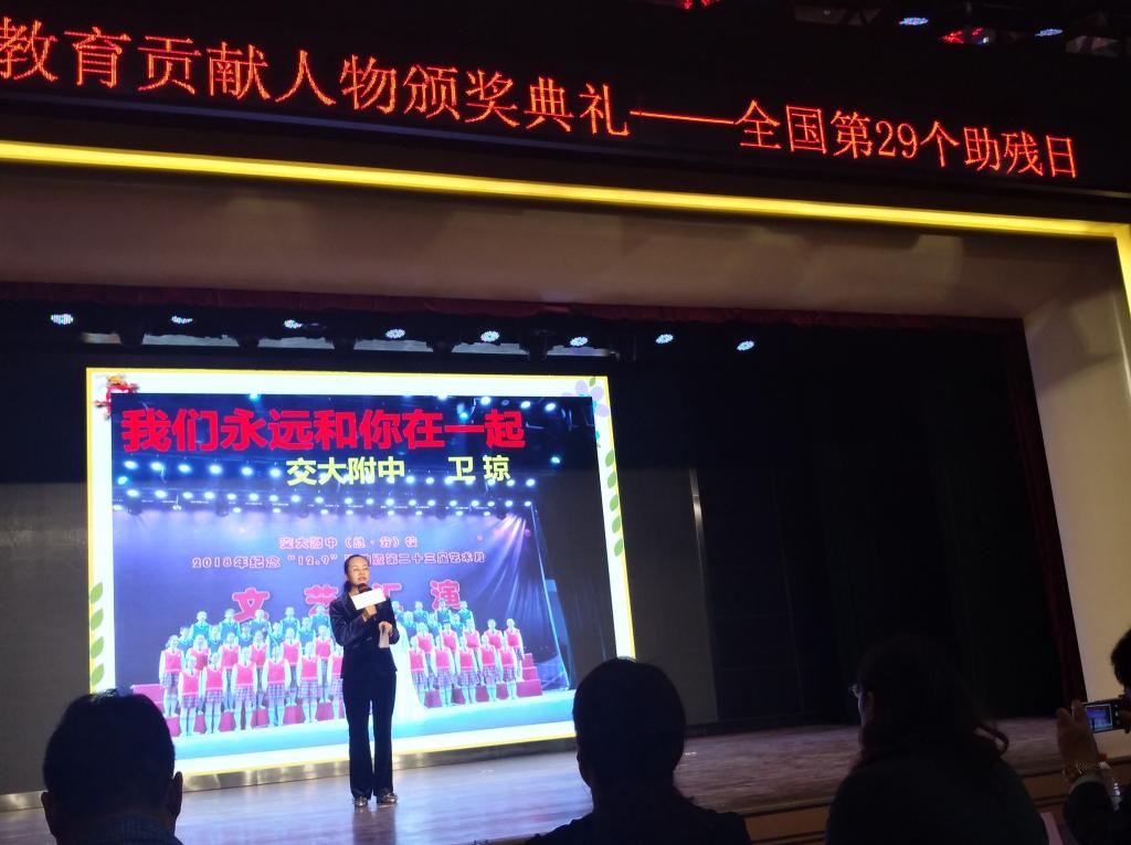 5月18日上午,由兰州市安宁区残疾人联合会、西北师范大学教育学院特殊教育系和兰州德爱心智障碍者社会服务中心共同举办的“全纳教育贡献人物颁奖典礼——全国第二十九个助残日”活动在西北师范大学举行。我校附属小学田艳琴老师和附属中学卫琼老师获得“全纳教育贡献人物奖”。