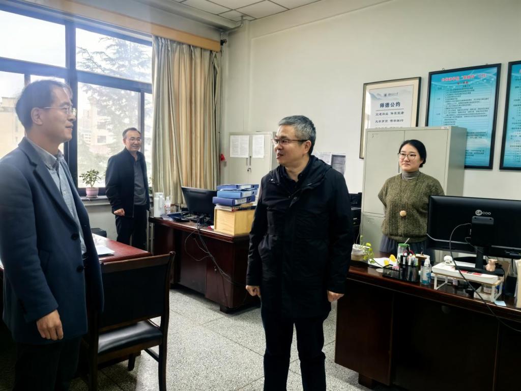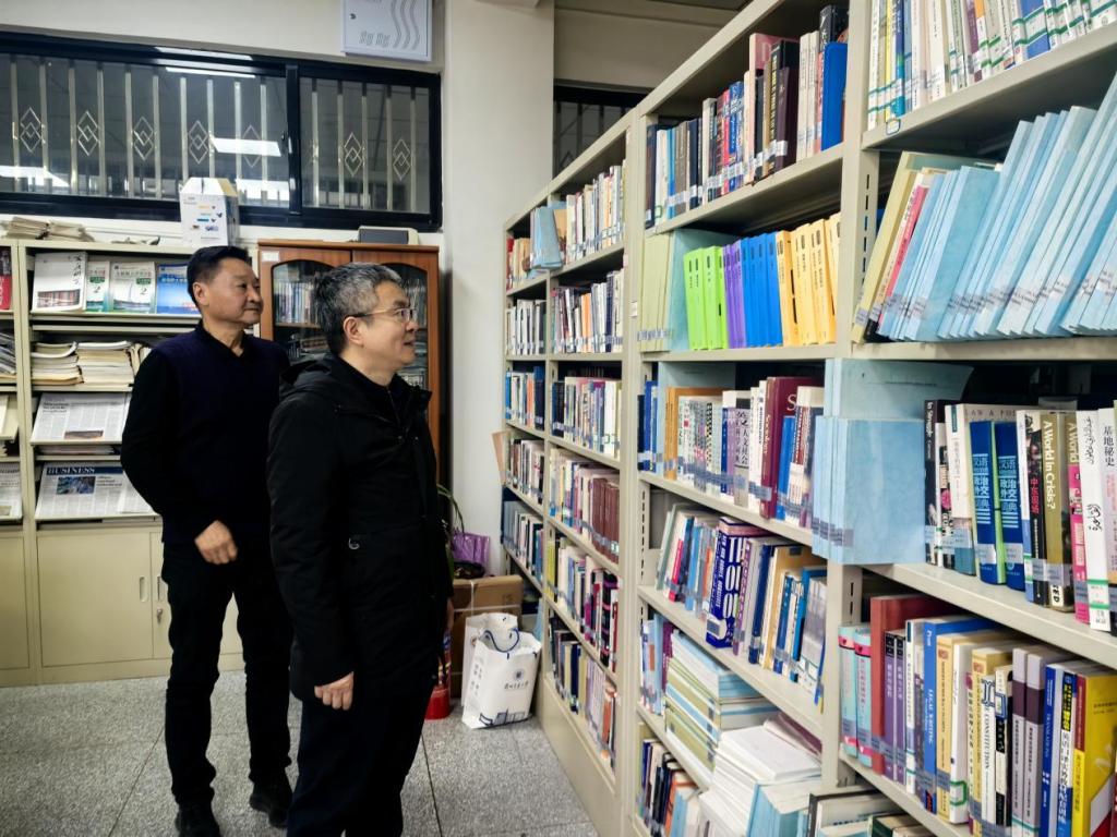 随后,在学院党政负责人的陪同下,他实地查看了学院语音室、图书资料室等教学设施,对教学与办公环境优化、资源配置效率等情况进行细致考察,并深入各办公室、系(教研室),向学院教师致以亲切慰问。