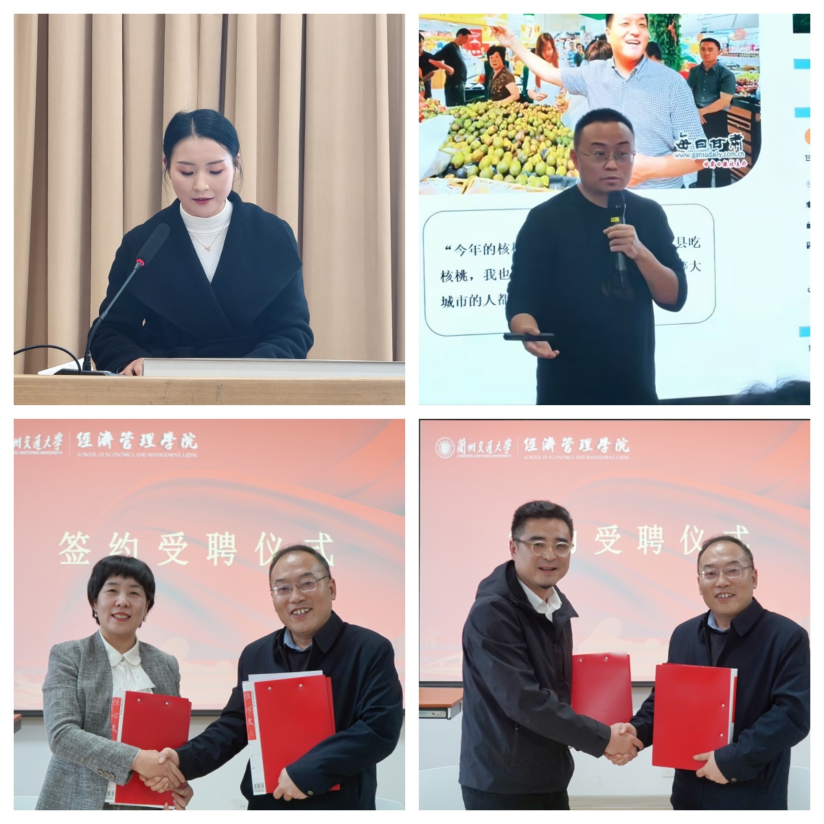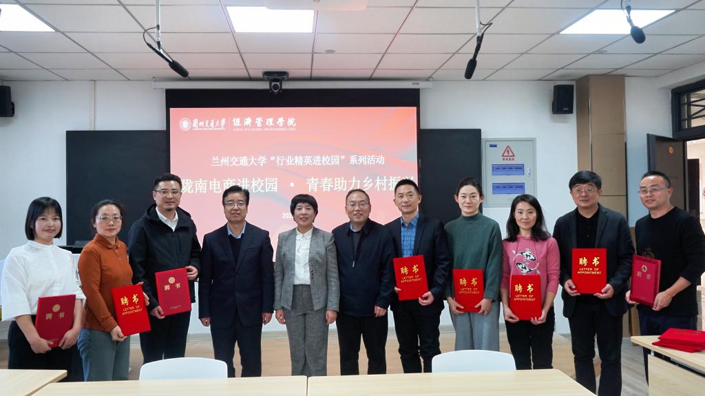 在座谈会上,经管学院院长介绍了经济管理学院历史沿革、师资力量、人才培养、社会服务、“十五五”发展目标等办学情况。他表示,学院学科优势、人才优势明显,“政校企”合作前景广阔,希望以此次交流活动为契机,推动“政校企”合作取得更加丰硕的成果。王小元详细介绍了陇南电子商务发展现状和成功经验,系统梳理陇南电商从“1.0版六路带贫”到“3.0版数商兴农”的迭代历程,深度解析“拾味陇南”区域公共品牌的打造逻辑与运营策略。她希望,双方利用各自优势,双向赋能,在人才培养、资源共享、课题研究、实习基地共建等方面展开深入合作。陇南电商协会会长徐涛分享了陇南电商发展的破局路径。会上签署了《陇南市电子商务发展局—兰州交通大学经济管理学院合作产学研基地协议》《兰州交通大学经济管理学院与陇南市电子商务协会合作协议》,并互聘专家,标志着经管学院与陇南“政校企”合作迈入实质性阶段。