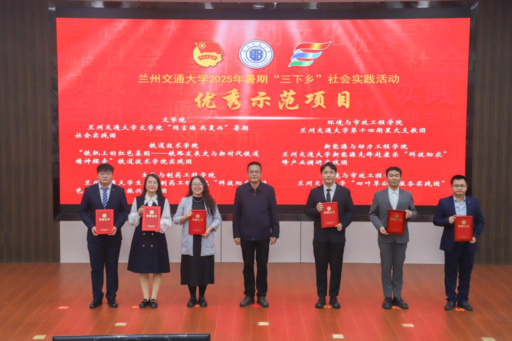 校团委负责人介绍了我校2025年“三下乡”社会实践活动的开展情况,宣读了表扬优秀项目团队的文件。党委宣传部负责人为优秀示范项目颁发荣誉证书。