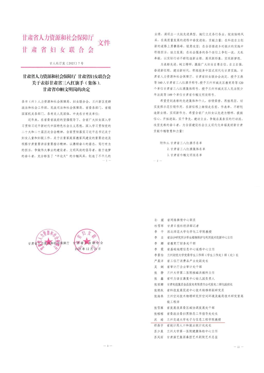 12月26日,甘肃省人力资源和社会保障厅、甘肃省妇女联合会联合发布《关于表彰甘肃省三八红旗手(集体)、甘肃省巾帼文明岗的决定》,我校电子与信息工程学院沈瑜教授被授予甘肃省三八红旗手荣誉称号。