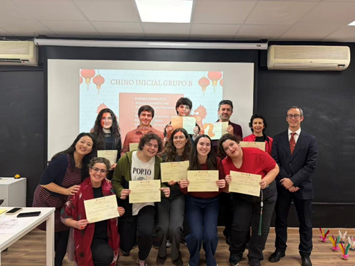 系列活动首先在塞维利亚大学孔子学院大楼拉开帷幕。楼内张灯结彩,洋溢着浓厚的节日氛围。本场活动以“中文学习结业证书颁发仪式暨春节文化体验”为主题。孔子学院外方院长冈萨洛和中方院长赖红玲共同为完成中文课程的学员颁发证书,表彰他们在语言学习上的努力与成就。