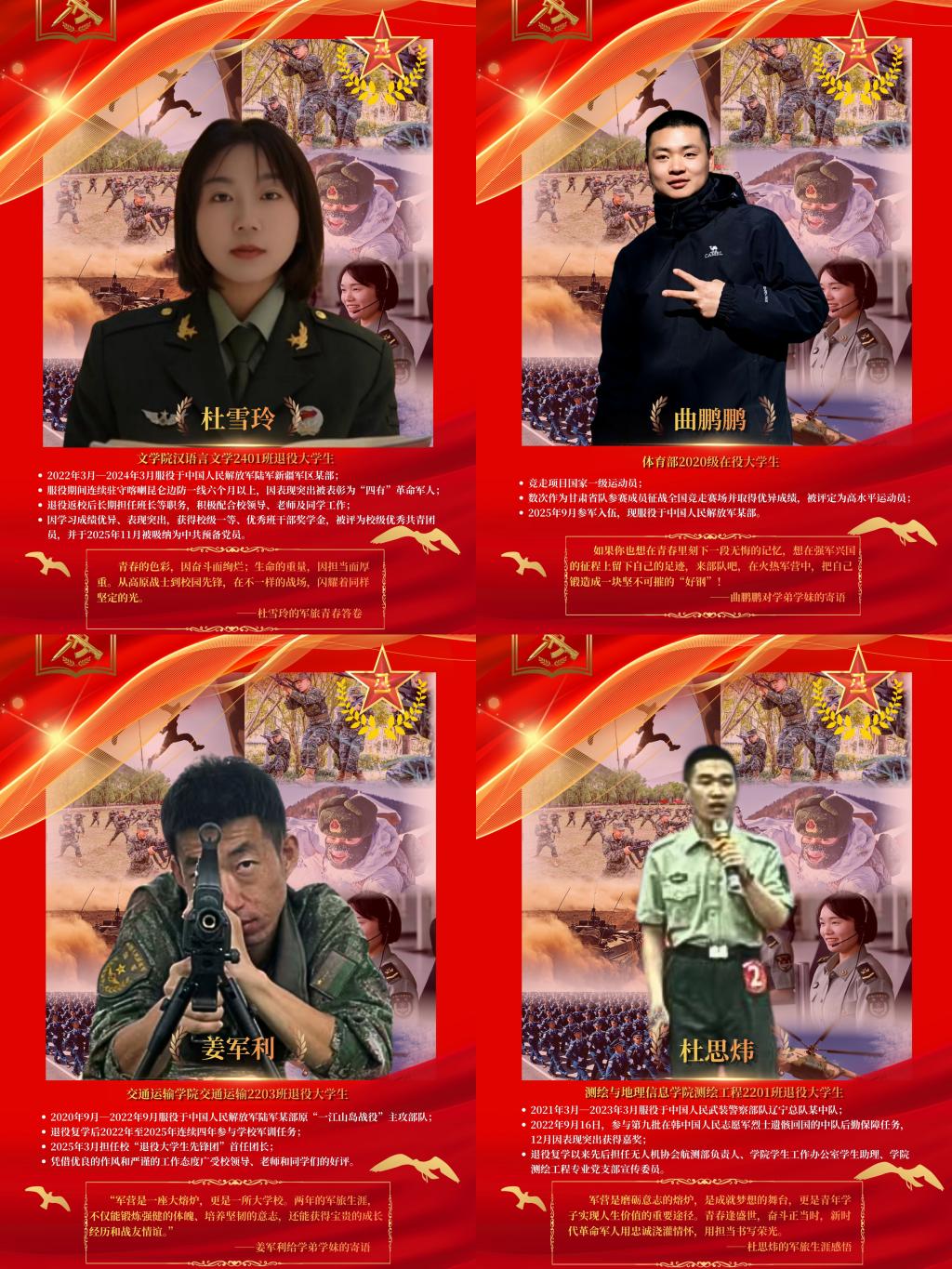 为充分展现我校退役大学生士兵“退伍不褪色、返校立新功”的昂扬风貌,以榜样力量激发广大学子投身国防、报效祖国的家国情怀,近日,由学生工作部(处)、党委人民武装部举办的退役大学生风采展示活动在师生中引发热烈反响,也为2026年下半年征兵工作营造了浓厚氛围、注入了强劲动力。
